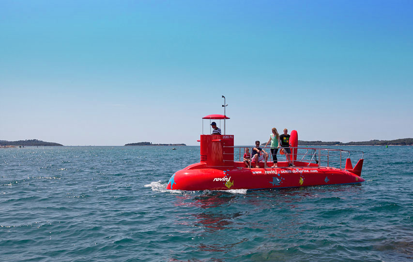 Viene chiamato mezzosottomarino perche' la parte superiore è visibile in superfice, mentre la parte inferiore si trova 1,5 m immersa sott'acqua. L' interno e' estremamente comfortevole. La vista fantastica del fondale marino e possibile grazie ai vetri dei finestrini che avvicinano e cosi' fanno sembrare tutto molto piu' vicino di quello che in realta' sia. Si naviga nelle vicinanze della cittadina di Rovigno e attorno alle isole vicine, offrendo una vista del fondale che raggiunge anche i 5 m di profondita'.